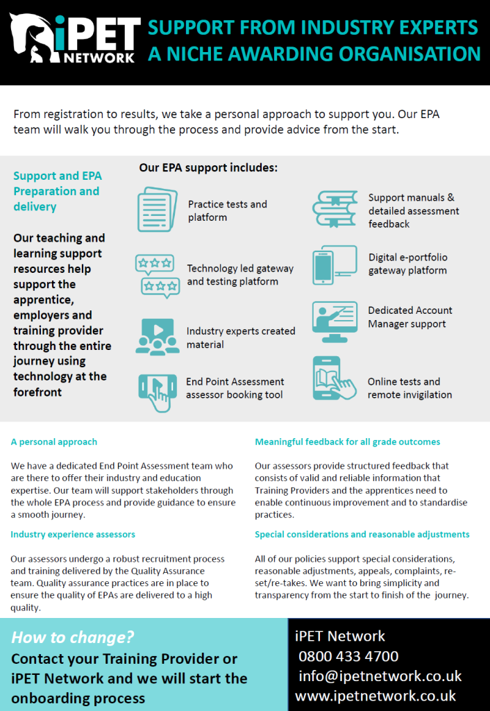 If you’re ready to become part of a trusted, regulated, and passionate Awarding Organisation that’s shaping the future of animal-care and Veterinary science education, contact Sarah Mackay (Director) on 0800 433 4700 or email epao@ipetnetwork.co.uk to find out more.